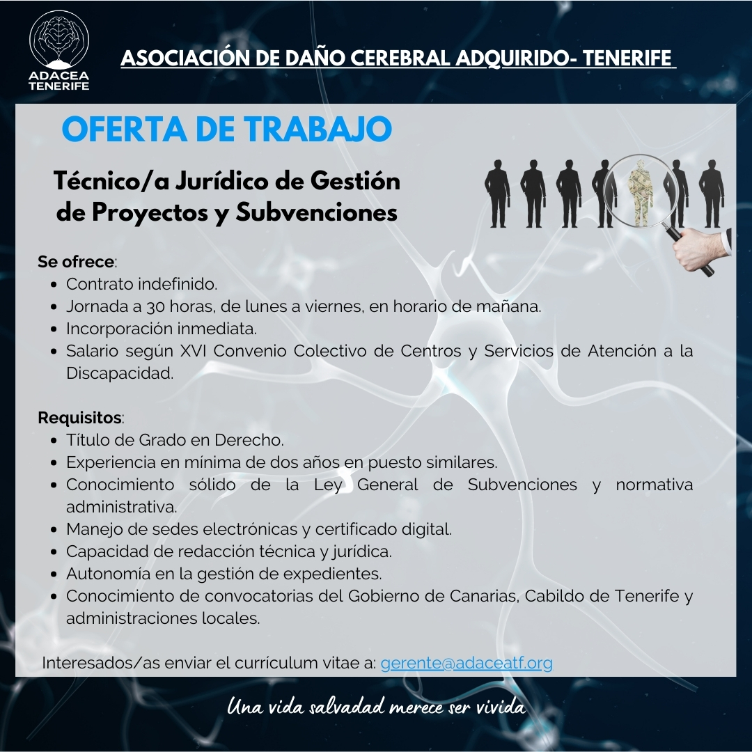 Técnico/a Jurídico de Gestión de Proyectos y Subvenciones Grupo II – Personal Titulado ADACEA-TF abre proceso de selección para la incorporación de un/a Técnico/a Jurídico